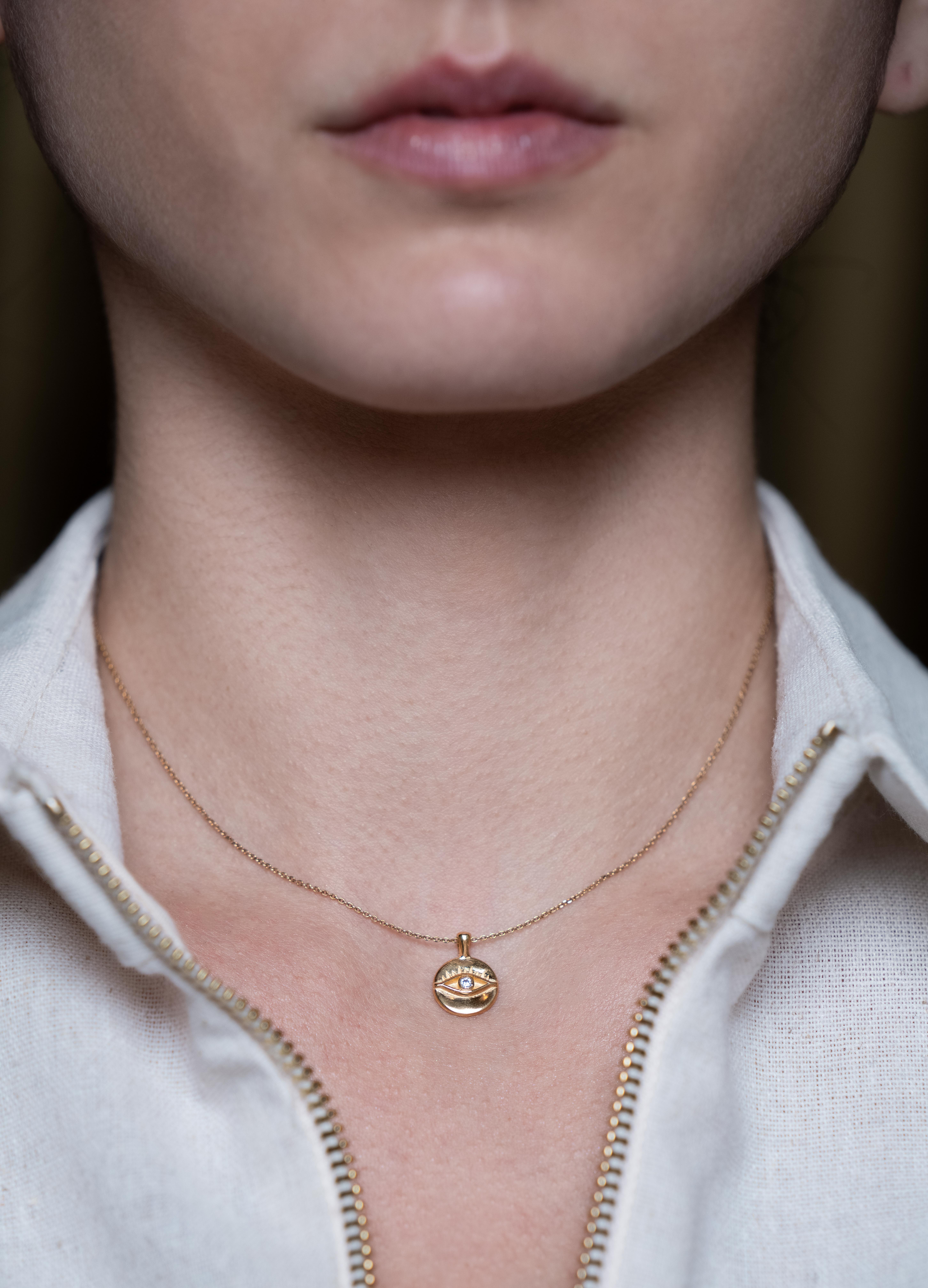 Crafted in luminous 14k gold, this eye pendant features a sparkling white diamond at its center and comes complete with a sleek matching chain. A meaningful design with a touch of modern elegance.