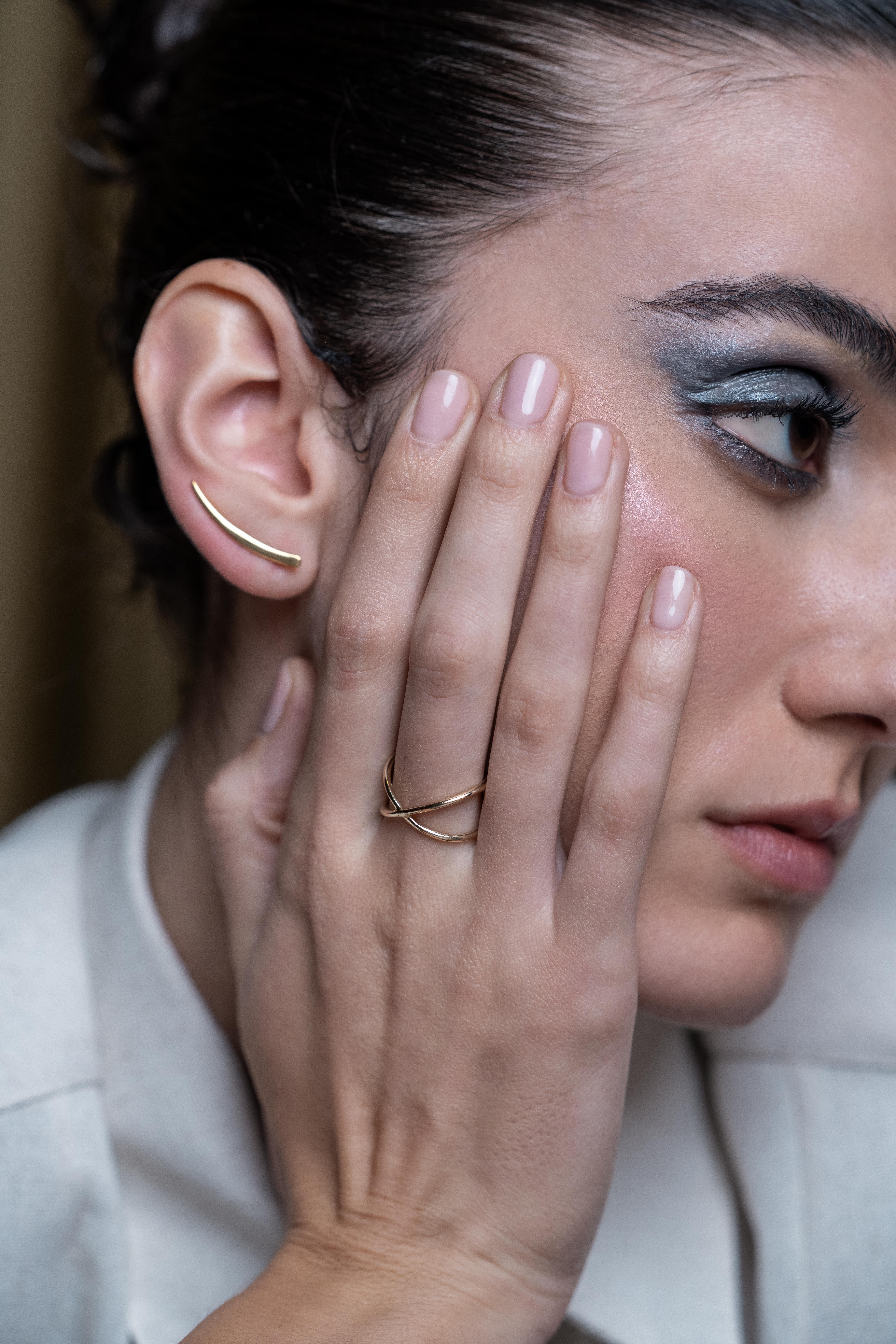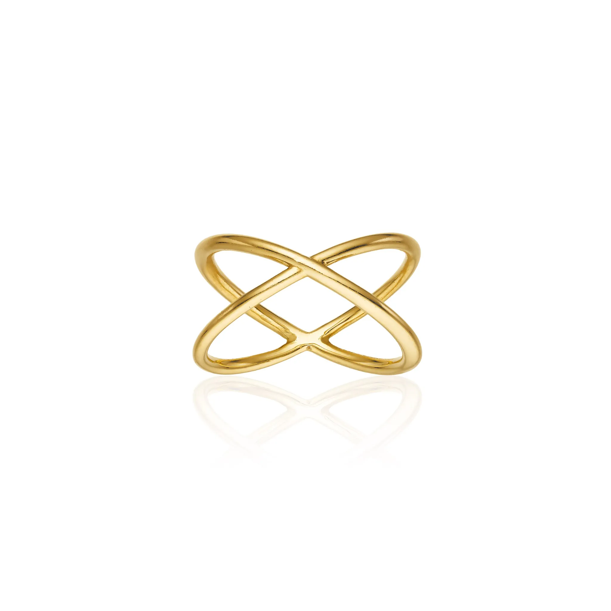 A modern X-shaped ring crafted in luminous 14k gold.